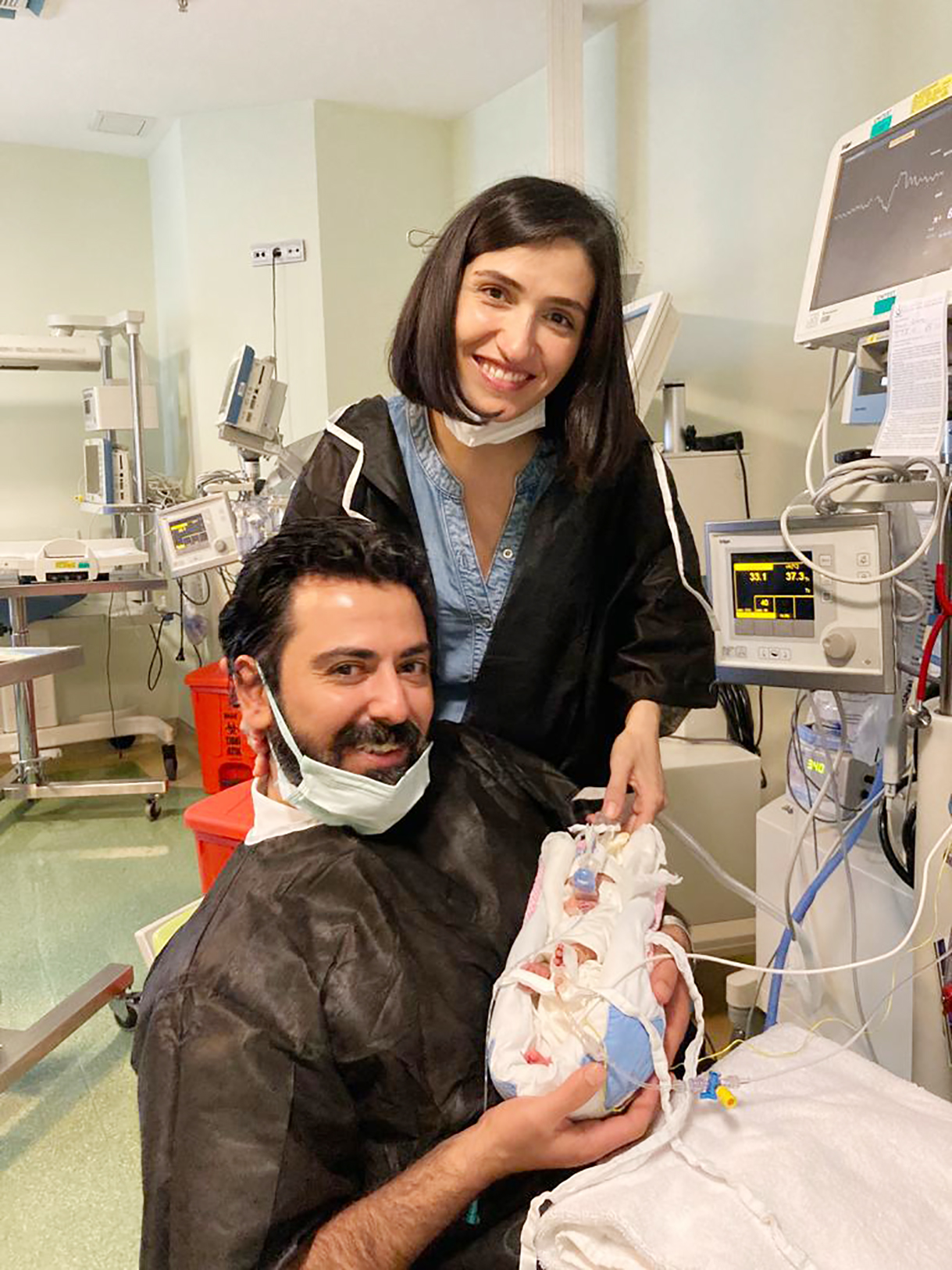 648 gram doğan bebeğini 8 saat sonra gördüğünü anlatan Babacan, “Entübasyon yapılmıştı, gördüğümde minicikti, parmakları simsiyahtı. Zayıftı sadece kaburgaları görülüyordu. Yaşayacağına inandık, bizi inandırdı. Riski fazlaydı, kalıcı bir hasar olabilirdi. Her gün öğlen ve akşam 10’ar dakika yoğun bakıma gidip ziyaret ediyorduk. Hiçbir şekilde dokunamıyorduk. Yavaş yavaş ellerine dokunmaya başladık, birkaç ay sonra kucağıma aldım. Kendi kendine nefes almaya başladı” dedi.